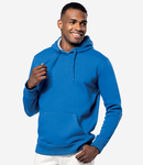 80% ringspun combed cotton/20% polyester. Low shrinkage brushed fleece fabric. Silicone wash. Drop shoulder style. Contrast inner hood and neck tape - heather grey on all colours except oxford grey is mid grey. Self colour drawcord. Front pouch pocket. Ribbed cuffs and hem.