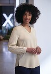 Long sleeve, 2 button single cuff, ribbed V-neck that crosses over at front, side vents.